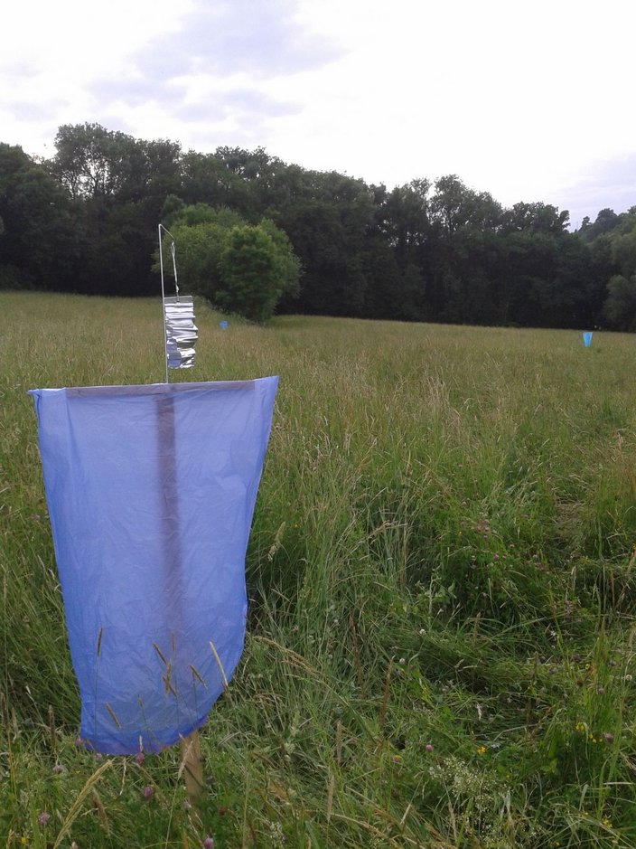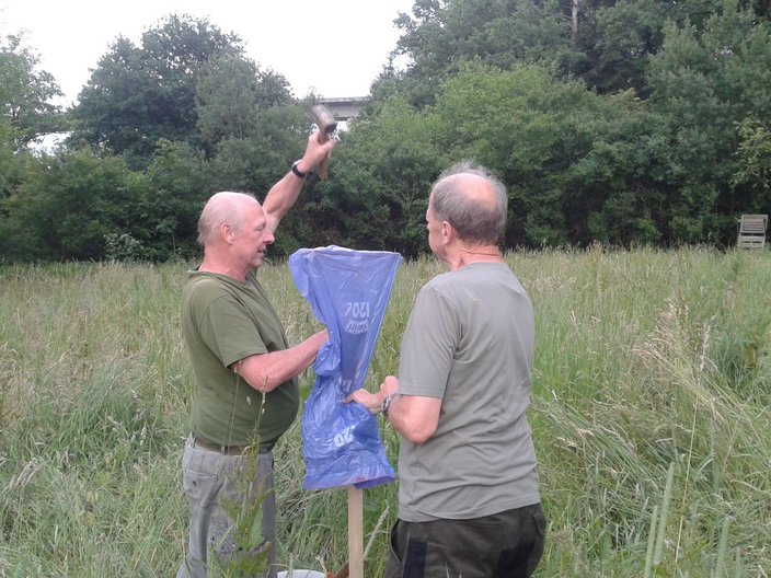 Blaue Müllsäcke, angebracht an einen T-Ständer aus zwei einfachen Latten, werden in Abständen von ca. 50 m in die Wiese gesteckt. Auf der Querlatte wird in einer Bohrung ein im Wind drehbarer „Galgen“ aus starkem Draht aufgesteckt. Im Handel erhältliche Duftstoffe, basierend auf Buttersäure, die einen unangenehmen Geruch verbreiten, werden auf ein im Wind klapperndes und im Sonnen-/Mondlicht blitzendes Blech aufgebracht (ebenfalls im Handel erhältlich). Entfernt sich der Mensch wieder und „die Luft ist rein“, wird die Rehgeiß ihre Kitze schleunigst aus der Wiese entfernen. Kurz vor den Mäharbeiten werden die Scheuchen wieder entfernt. Dank dieses Einsatzes und dieser Methoden konnte die Zahl der Rehkitze, die Opfer von Mähunfällen wurden, in Ostfildern Jagdbogen II in den letzten Jahren drastisch reduziert werden.
