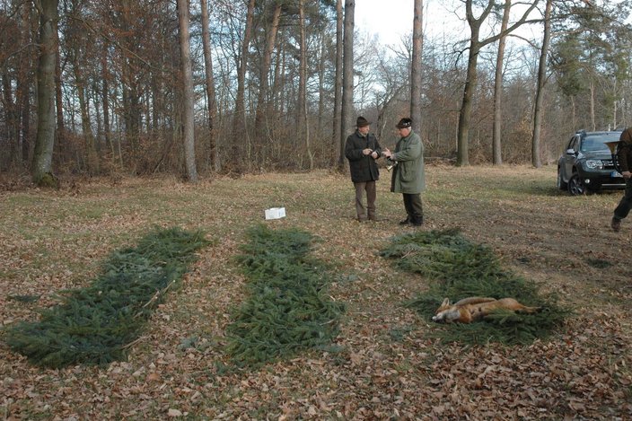 Die Fuchswoche, oder wie vom LJV neuerdings empfohlen „Die Artenschutzwoche“, ist ein wichtiger Bestandteil der Hege innerhalb der Hegegemeinschaften der JV Esslingen. Auch wenn die Bilder der Strecke leider ein anders Bild vermitteln, war die Artenschutzwoche mit insg. 72 Füchsen in diesem Jahr recht erfolgreich. Zum Abschluss der Artenschutzwoche trafen sich viele Jäger der JV Esslingen am Flugplatz in Jägerhaus zum gemeinsamen Strecke legen. Bei besten Wetter und nach dem Verblasen der Strecke klang der Nachmittag bei Leberkäs Semmeln und Glühwein gemütlich aus.