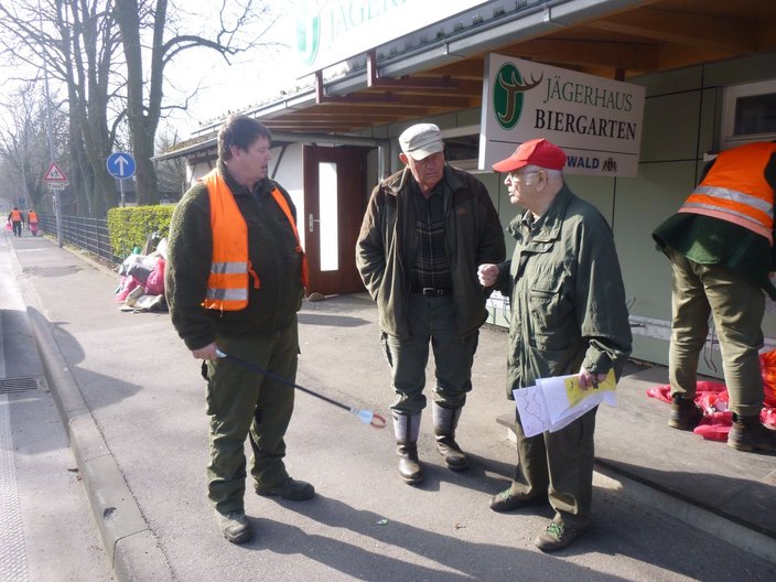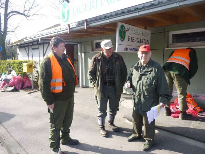 Bei bestem Wetter am 25. März 2017 und mit 9 teilnehmenden Jägern waren wir wie immer erfolgreich. Viele rote Sammeltüten, die vom Bauamt der Stadt abgeholt werden, zierten den Straßenrand. "Schlaue" Bürger, so hat man den Eindruck, "beliefern" den Waldrand, um sich kostenlos vom Müll zu trennen. Reifen, Teppiche, eine Stehlampe und drei Türen waren im Sammelgut. Schwerpunkte sind Parkplätze, gegenüber der Deponie, Grillplatz und gut befahrbare Wege in den Wald hinein. Abschließende trifft man sich bei den Kleingärtnern, die für die gegrillten Roten, Spende der Stadt, und das Bier verantwortlich zeichnen. Dann und wann findet sich ein "Stadtoberere", um Dank zusagen ein. In diesem Jahr war es der Baubürgermeister Wallbrecht.