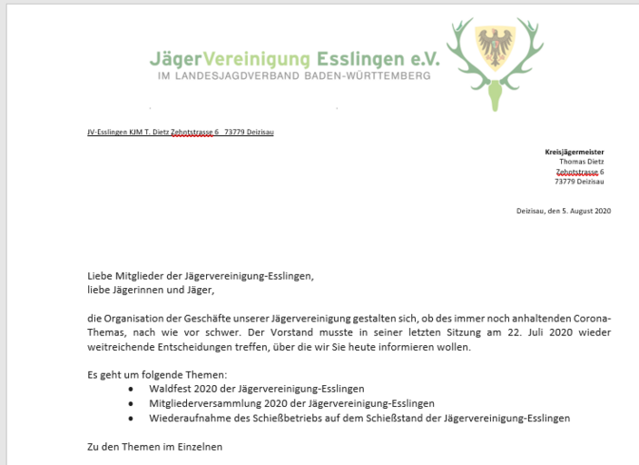 die Organisation der Geschäfte unserer Jägervereinigung gestalten sich, ob des immer noch anhaltenden Corona-Themas, nach wie vor schwer. Der Vorstand musste in seiner letzten Sitzung am 22. Juli 2020 wieder weitreichende Entscheidungen treffen, über die wir Sie heute informieren wollen.