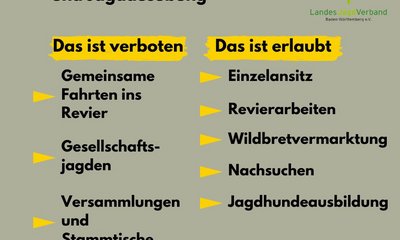 Nach unserer (LJV) Einschätzung ist die Ausübung der Jagd, die derzeit in Form der Einzeljagd ausgeübt wird, nicht von diesem Versammlungsverbot…