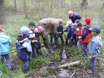 Für die Kinder der Hotzenplotzgruppe des Kindergartens Sonnenbühl in Leinfelden-Oberaichen ging es gleich am Morgen des 3. Mai los Richtung Wald. Nach ersten Erkundungen stärkte sich die Gruppe auf einer Wiese mit einem gemeinsamen Frühstück. Begleitet vom Revierpächter Thomas Spreng und einem seiner Mitjäger Enrico Holm gingen die Kinder auf Spurensuche von Wildschweinen und Rehen, entdeckten in einem Wasserloch Kaulquappen, und durften jagdliche Einrichtungen inspizieren.